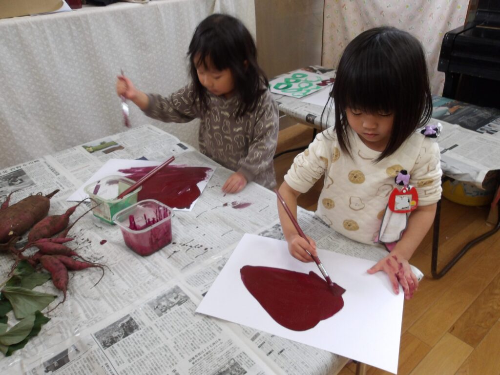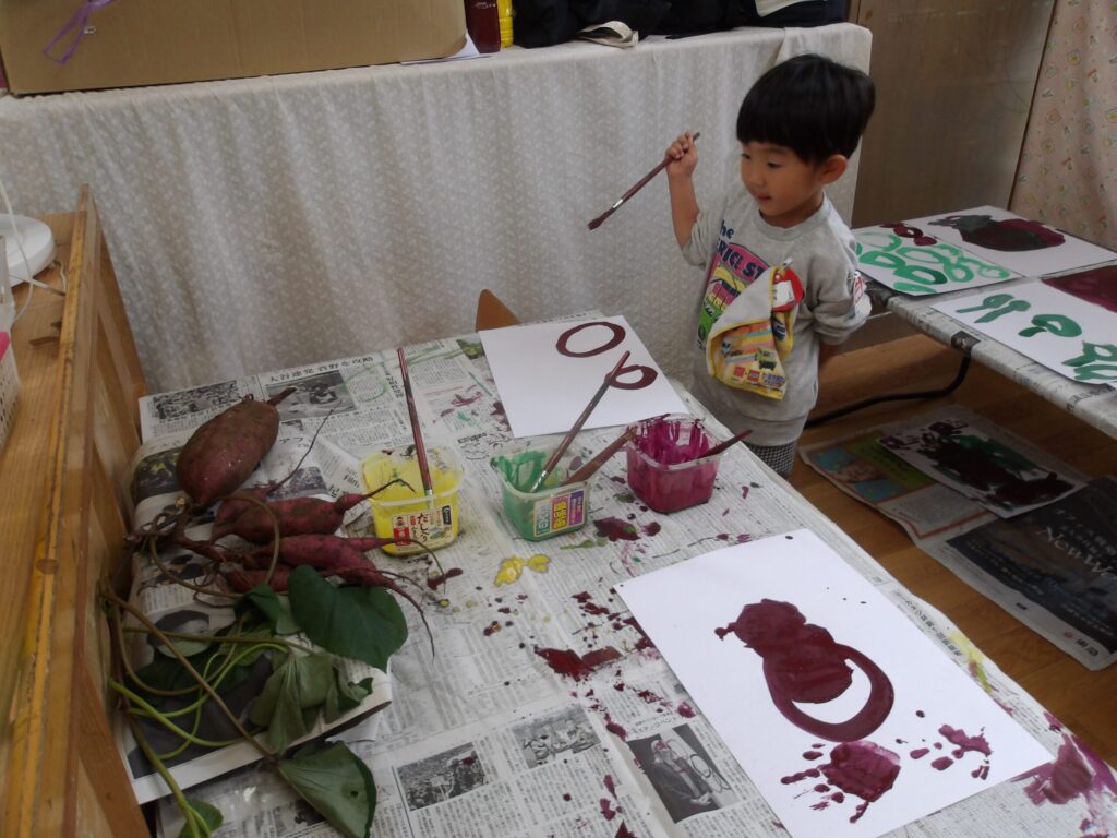 おいもの色や形を見て丸くかいていく子もいたり、一面の大きいおいも、と思って描いていったりと色々なおいもができていきました。筆を持つと黙々とかき進めていく子が多くて驚きました!