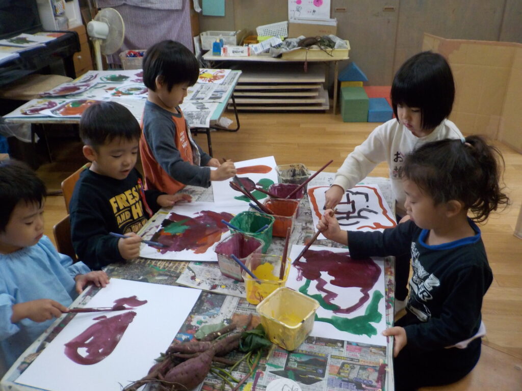 お休みの子はまた描こうね。みーんな描けたので、今日、おいもを食べていると思います。お味はどうだったかな♥絵の具もまたやろうね♪